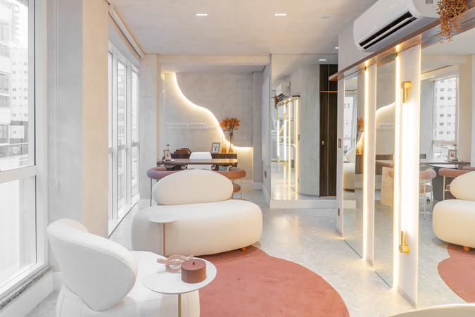 Logo ao entrar no espaço, a atmosfera acolhedora se revela por meio das formas orgânicas do mobiliário, da iluminação suave e do espelho estrategicamente posicionado, ampliando o ambiente e reforçando a sensação de bem-estar.